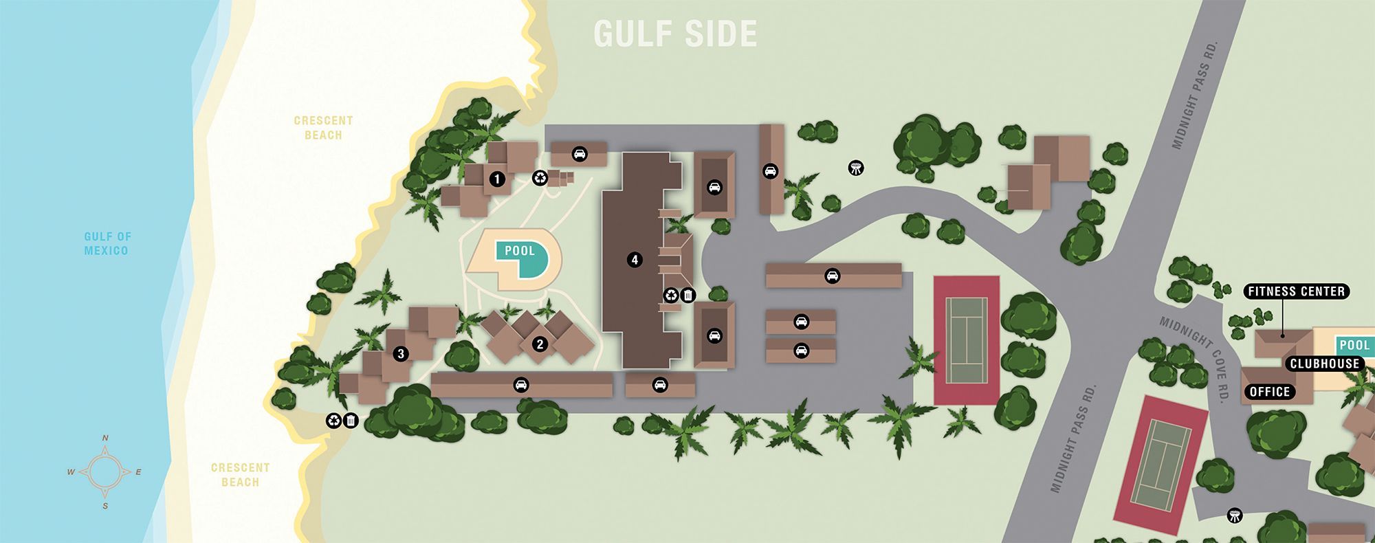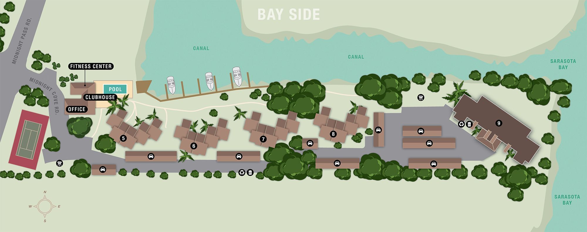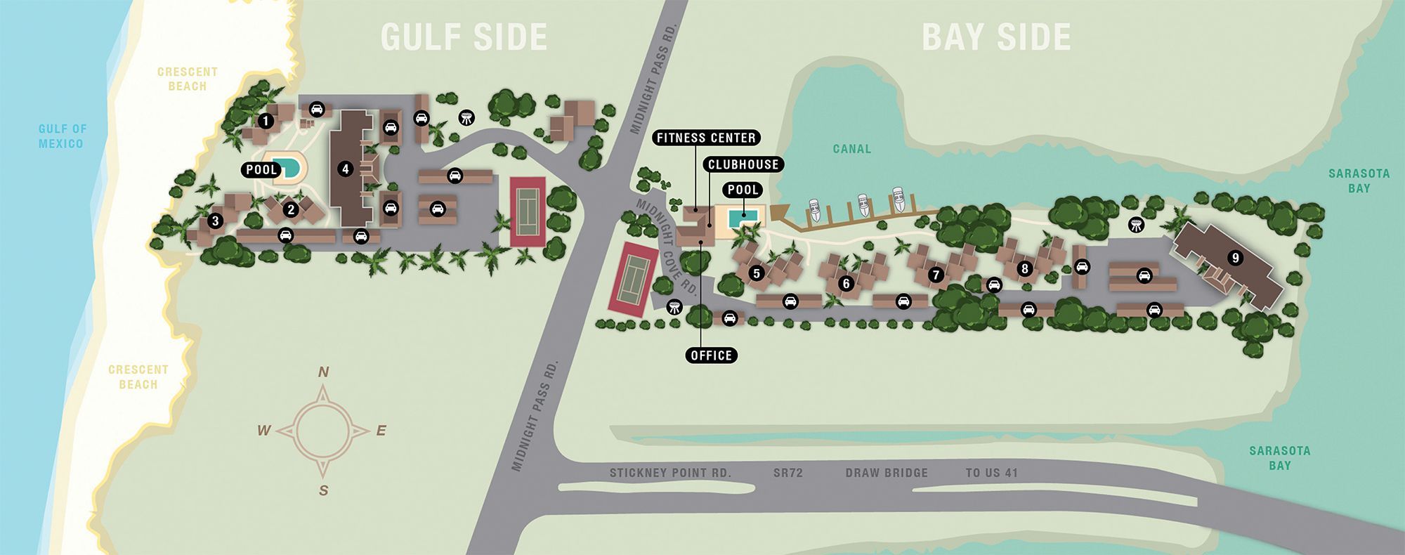 Midnight Cove sits on 11 acres of lush, tropical and floral greenery that spans from the azure waters of the Gulf of Mexico on the west coast of Siesta Key to the serene and tranquil waters of Sarasota Bay/Intercoastal Waterway on the east side of the island. Stay Gulfside for spectacular beachfront views & amazing Siesta Key sunsets or Bayside to enjoy the calm waters of the Bay and the tranquil setting of the Intercoastal Waterway.